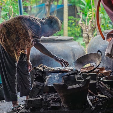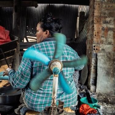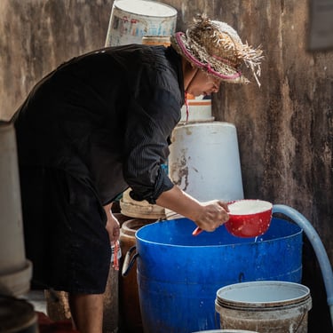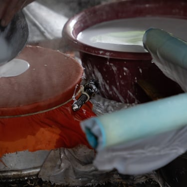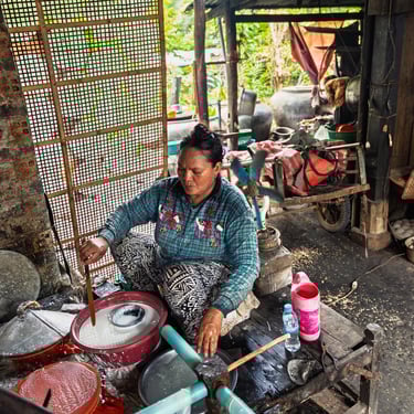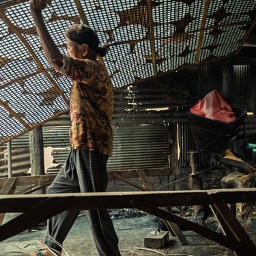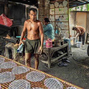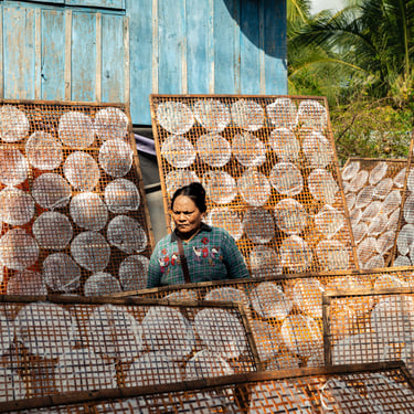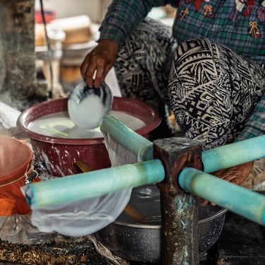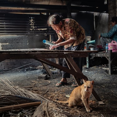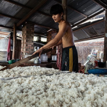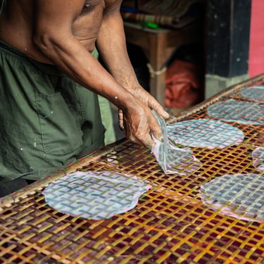 Le immagini raccontano momenti quotidiani di una famiglia che ha fatto di questo mestiere un’eredità e un’identità. Con gesti precisi e ripetuti, tramandati di generazione in generazione, l'impasto di riso viene steso sottilissimo su grandi piastre roventi, poi trasferito con cura su griglie di bambù ad asciugare sotto il sole cocente. Ogni sfoglia è il risultato di pazienza, tecnica e armonia con l’ambiente circostante.