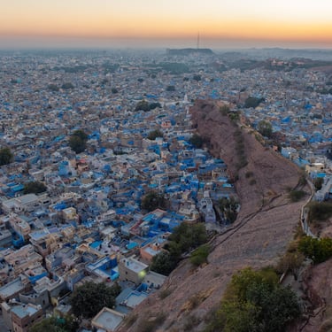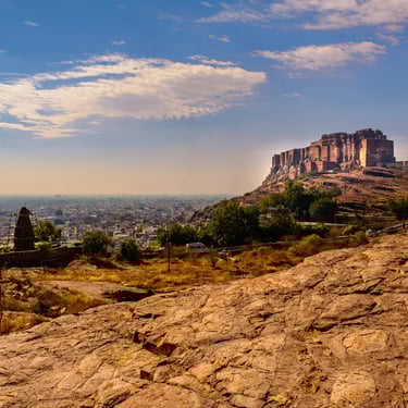 A Jodhpur, la “Città Blu”, l’impressionante Forte Mehrangarh domina la città da una rupe vertiginosa. Costruito con mura spesse e bastioni colossali, custodisce al suo interno palazzi affrescati, sale reali e balconi traforati con vista mozzafiato sull’oceano di tetti azzurri sottostante.