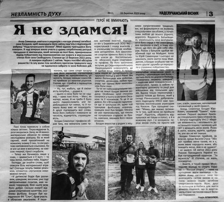 Il 1° aprile, più di mille persone si radunarono nel villaggio di Berezne per salutare Bohdan. Alla, pur sopraffatta dal dolore, parla di lui con orgoglio. “Mio figlio era un uomo straordinario, pieno di vita, di valori e di coraggio. Ha vissuto poco, ma ha lasciato un segno indelebile in tutti noi”.