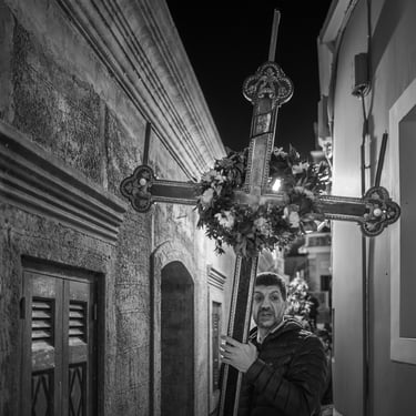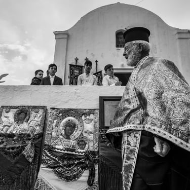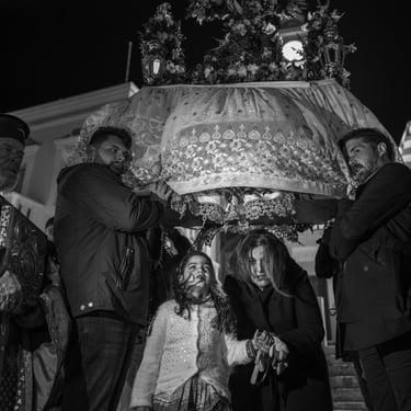 Qui, l’Epitáphios viene decorato anche con le fotografie dei defunti, un gesto che lega il presente al passato, il sacro al personale. Il corteo, illuminato solo dalla luce fioca delle candele, attraversa il villaggio in un silenzio solenne. Ogni famiglia attende davanti alla propria casa con le porte spalancate: quando l’Epitáphios arriva, il sacerdote si ferma per benedire la soglia, e i nomi dei defunti vengono sussurrati nella preghiera collettiva.