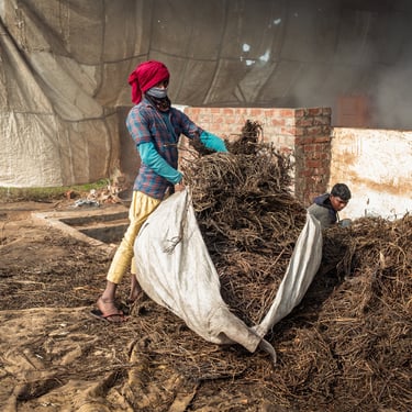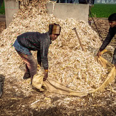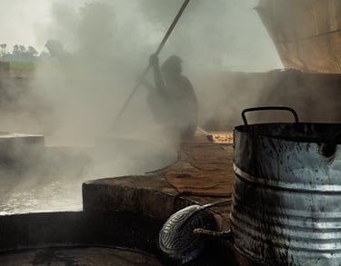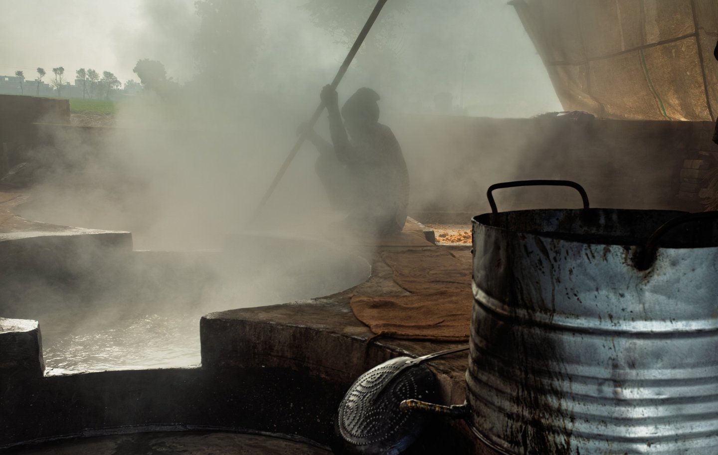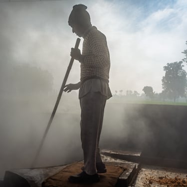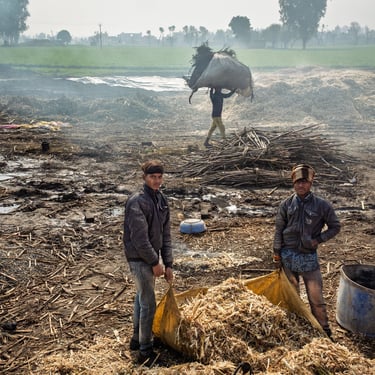 I lavoratori, quasi tutti provenienti da famiglie povere del Punjab, trascorrono ore e ore accanto a calderoni ribollenti, alimentando le fornaci con legna o scarti della canna stessa. Il fumo è costante, spesso insopportabile. Avvolge tutto: i corpi, le voci, persino il tempo. I gesti sono ripetuti ma non meccanici: bisogna tagliare, spremere, cuocere il succo grezzo finché non diventa una massa densa, da raffreddare e modellare. È un lavoro che non conosce tregua: la calura è intensa, le condizioni igieniche minime, le protezioni inesistenti.